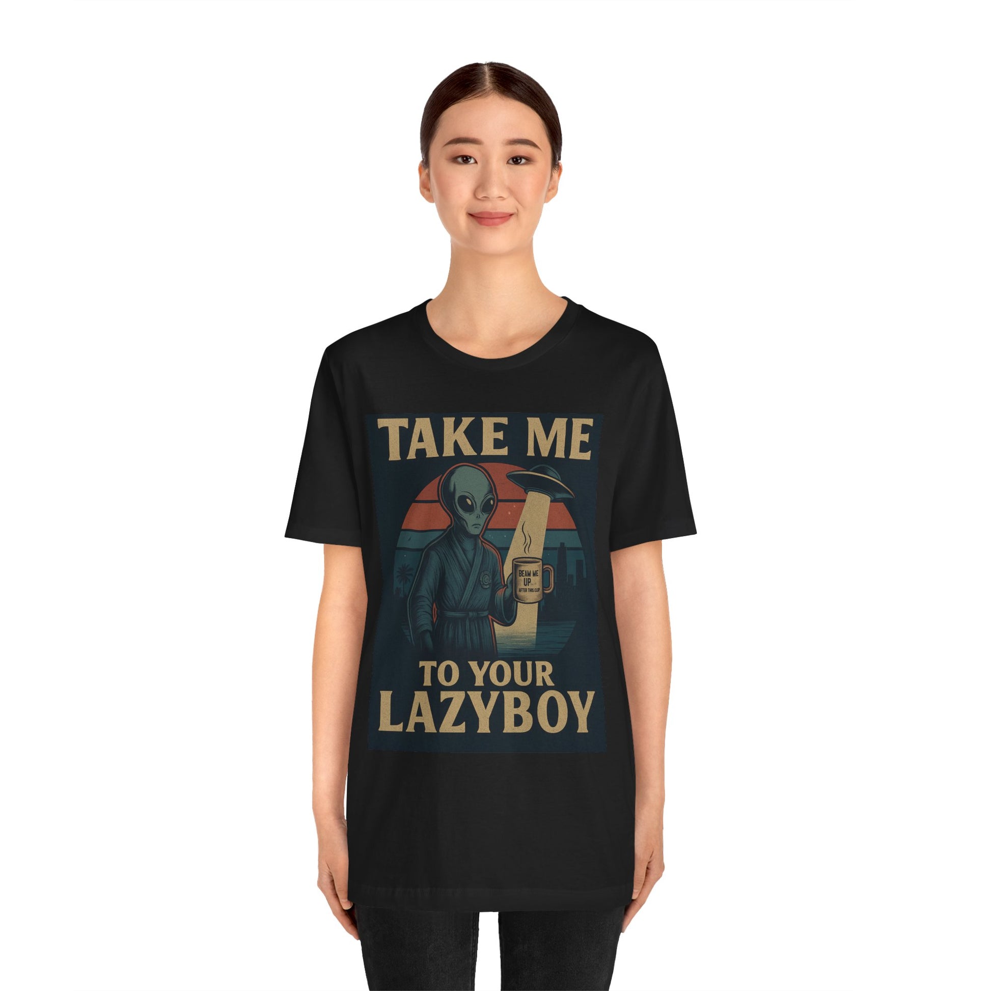Some abductions can wait — at least until after coffee. The Take Me to Your LazyBoy tee delivers the perfect blend of sci-fi humor and laid-back vibes. Featuring a chilled-out alien in a bathrobe, holding his essential brew, this design is perfect for anyone who believes in comfort over chaos. Whether you're a coffee addict, a fan of alien humor, or just love a good lazy day, this shirt was made for you.